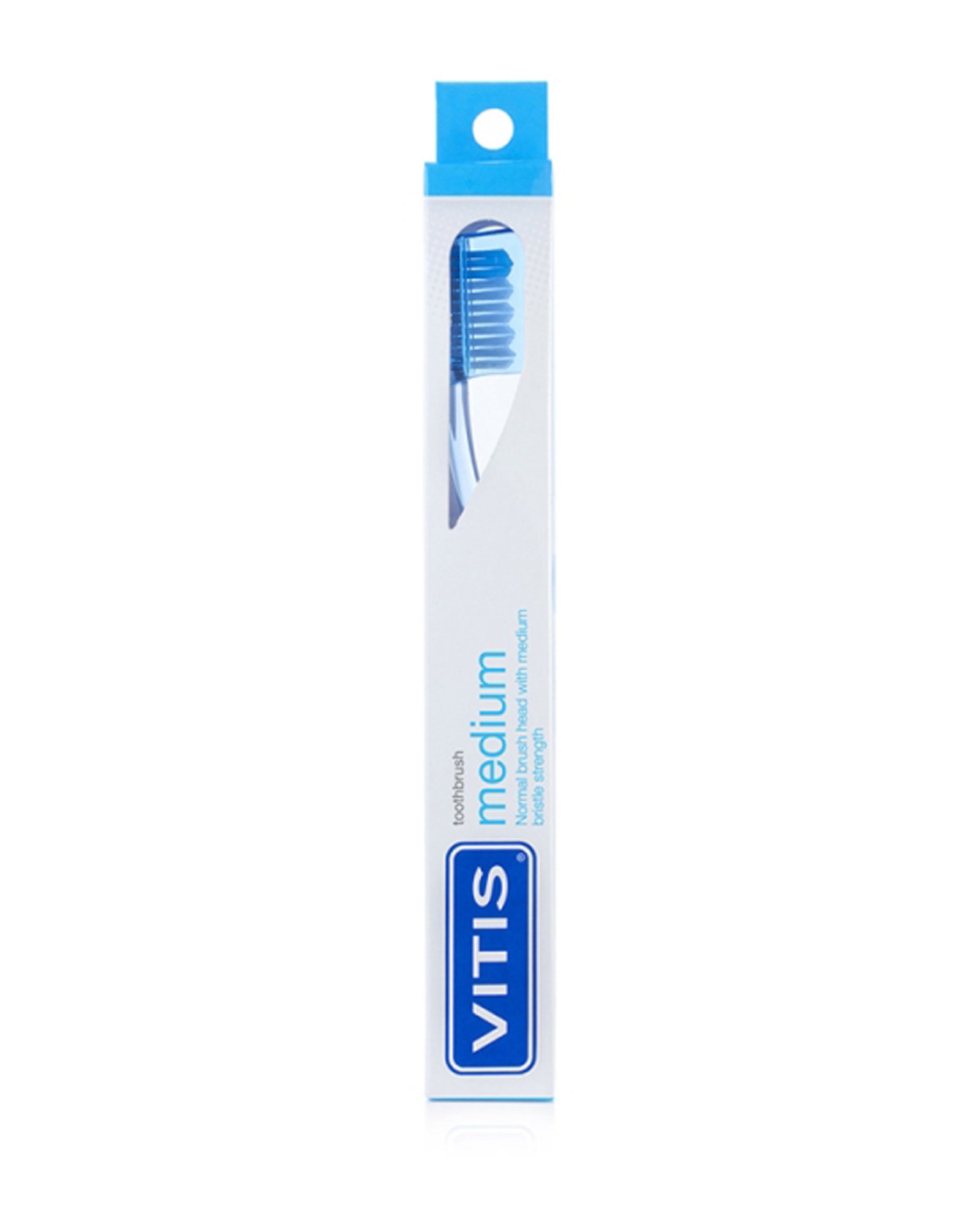 VITIS® medium is a daily-use toothbrush and features a diamond-shaped head that allows access to hard-to-reach areas of the oral cavity. Its hard filaments with an undulating profile facilitate access to interdental spaces and adapt to the shape of the teeth.