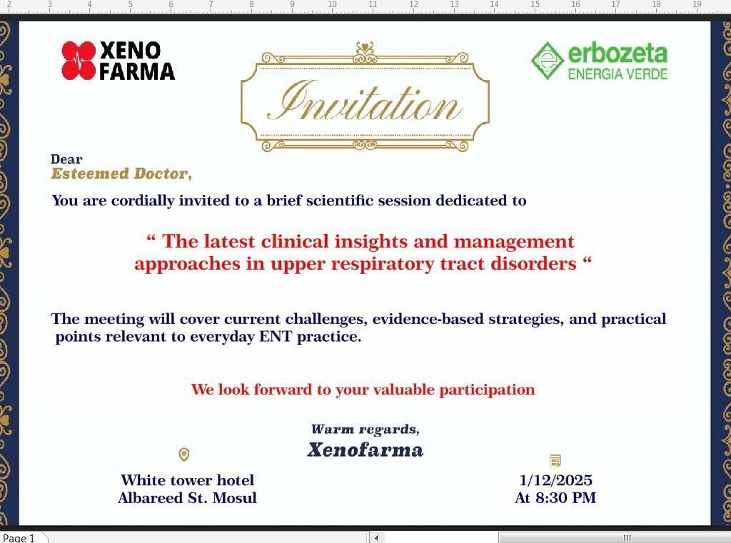 XenoFarma, in collaboration with Erbozeta – Energia Verde, successfully organized a scientific educational session for otolaryngologists in Mosul on Monday, December 1, 2025, at the White Tower Hotel.